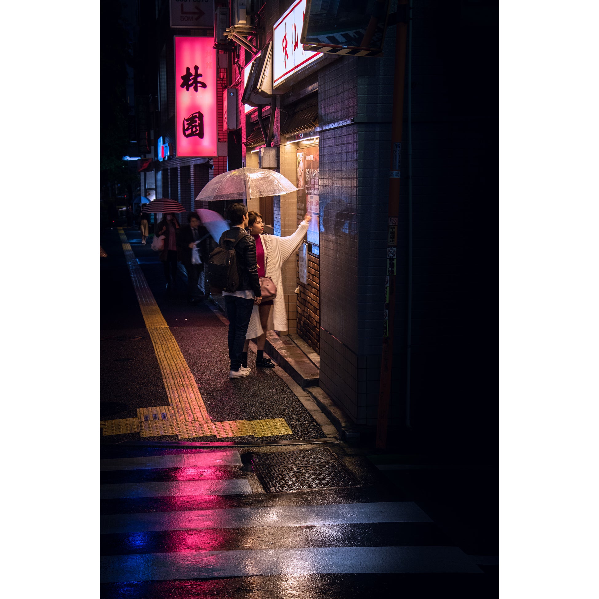 In Tokyo on a rainy evening, a young couple's shared moment unfolds by the warm glow of a restaurant window, merging intimacy, ambiance, and intrigue amidst the rain-slicked streets.